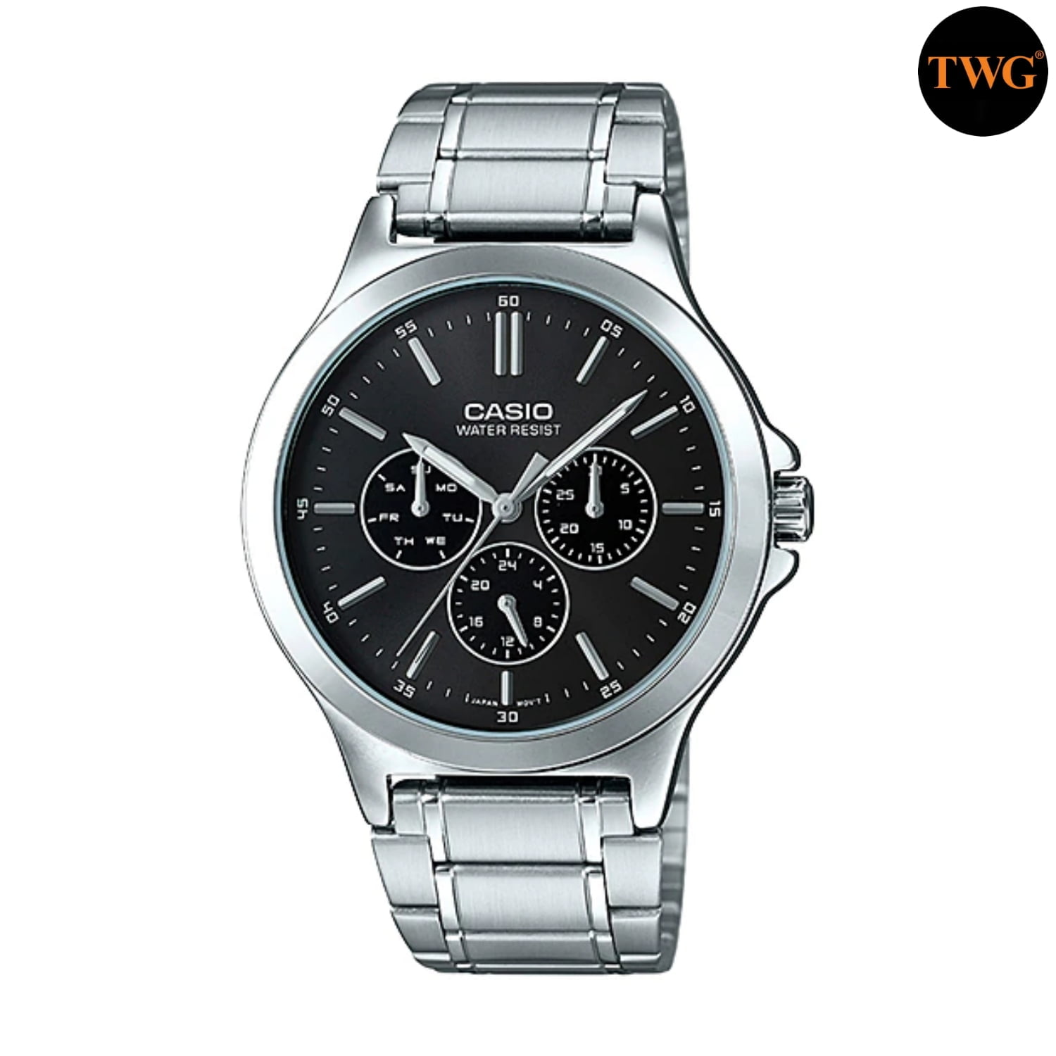 Analog: 3 hands (hour, minute, second), 3 dials (date, day, 24-hour) - Accuracy: ±20 seconds per month