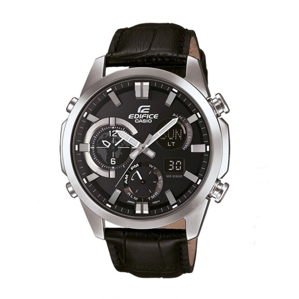 The Mens analogue / digital combination Edifice ERA-500D-1A features a black dial with blue accents and luminous hands and markers. The ERA-500D-1A has a Day & Date function as well as a thermometer amongst other features.