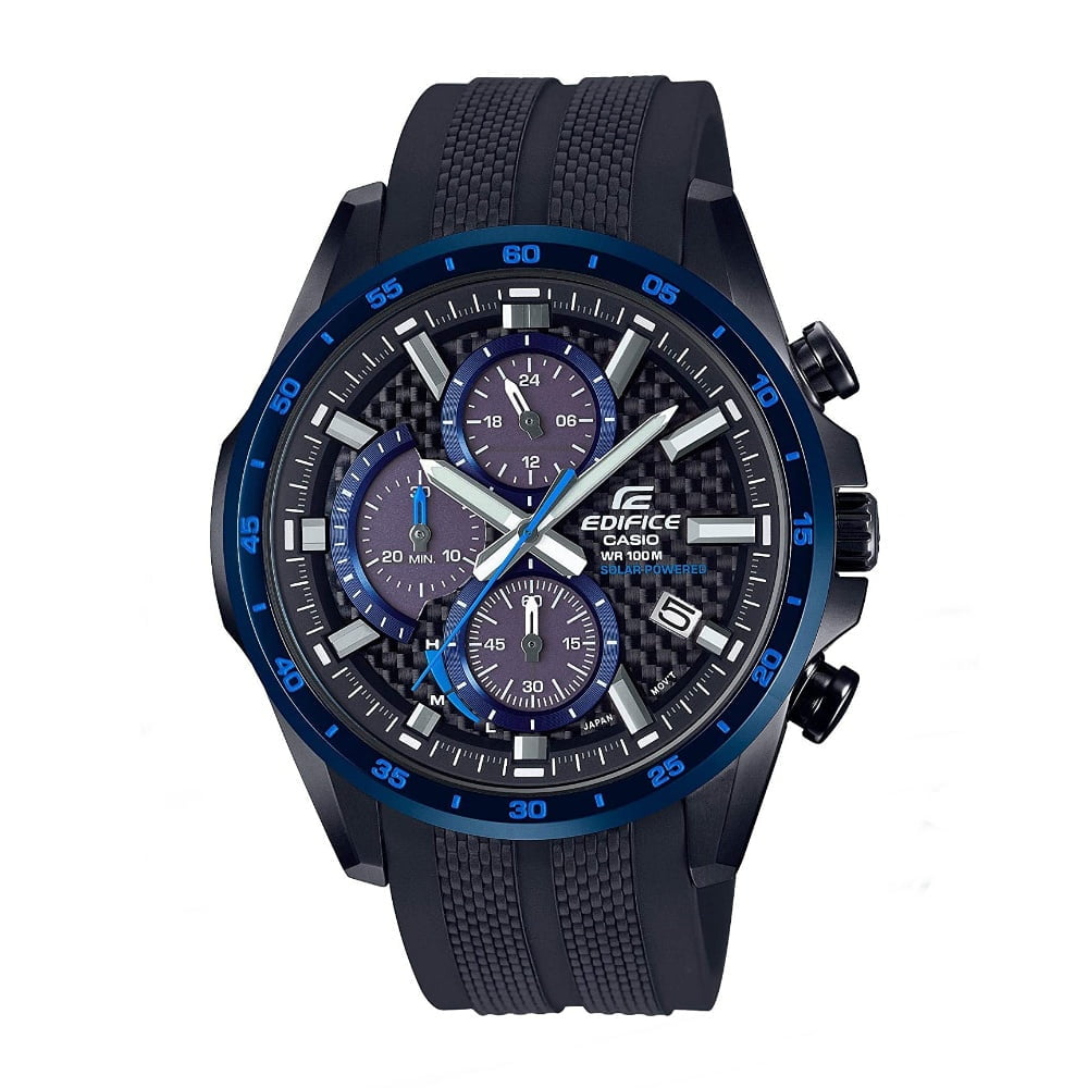 Tough solar, carbon dial, 1-sec Stopwatch, Battery level indicator, Date, regular time keeping.