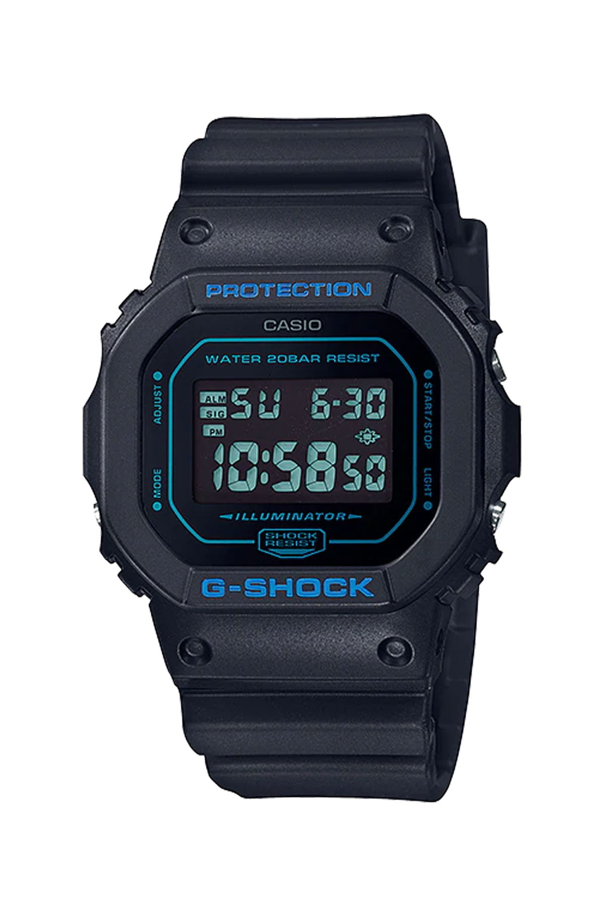 Matte black & blue series, shock resistant, Electro-luminescent backlight, flash alert, 5 daily alarm, 1/100-sec stopwatch, countdown timer, Multi-function alarm.