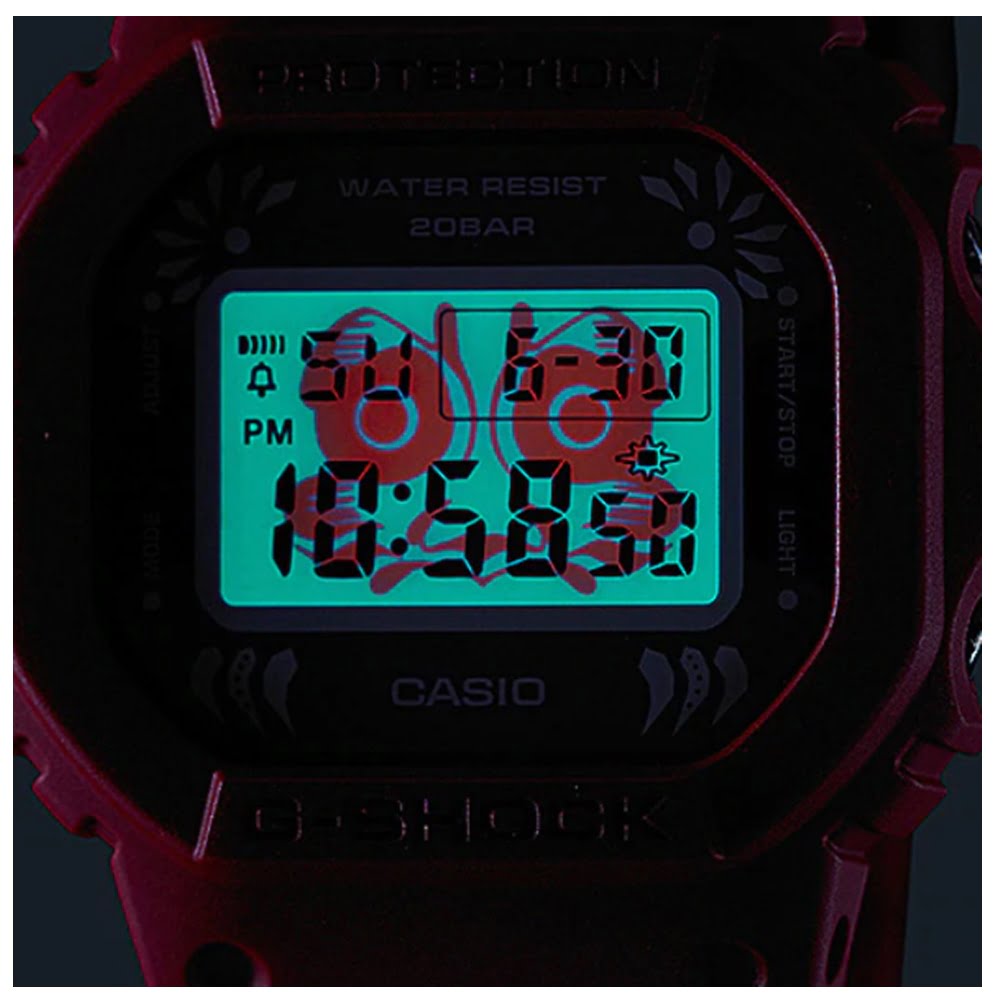 Base model is the original square-face DW-5600. The DW-5600DA model features a Daruma red body with the image of a Daruma printed on its face. Turning on the watch’s backlight causes a Daruma face to float up on the display.The band ring of this model is printed with a Daruma image.