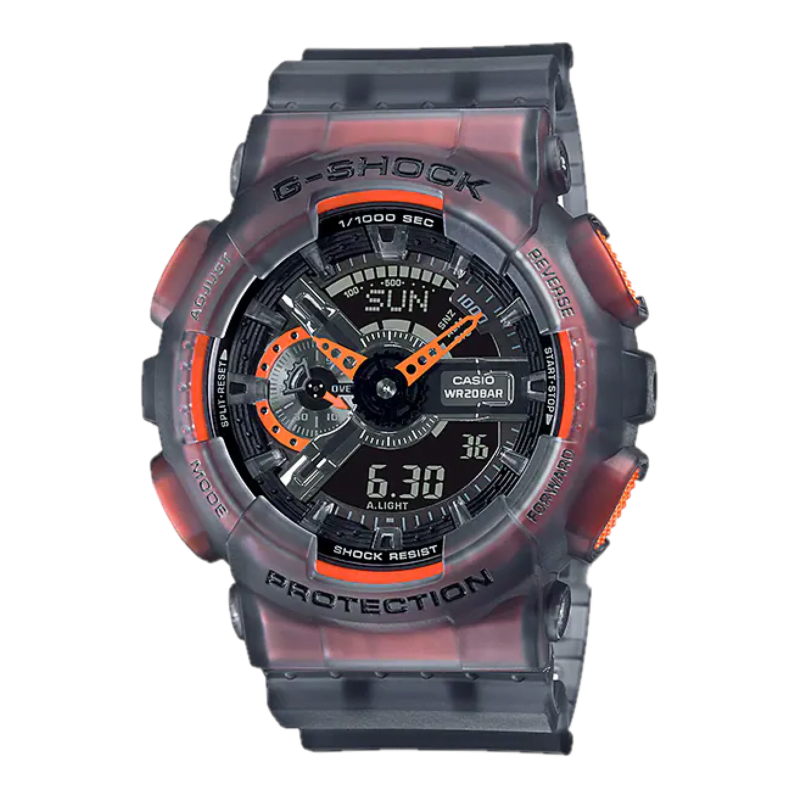 The analog-digital GA-110 combination model uses fluorescent color accents for the face and hands for cool designs.