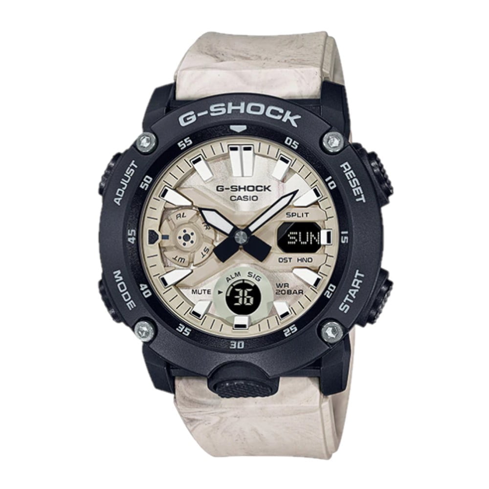 The GA-2000WM has a carbon core guard structure and a large front button, with a black bezel for a subdued look.