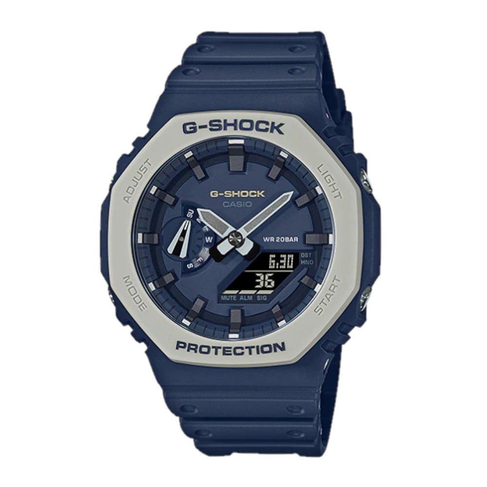 The basic design combines a slim case with an octagon double-molded bezel, decked out in a choice of dark navy blue or gray.