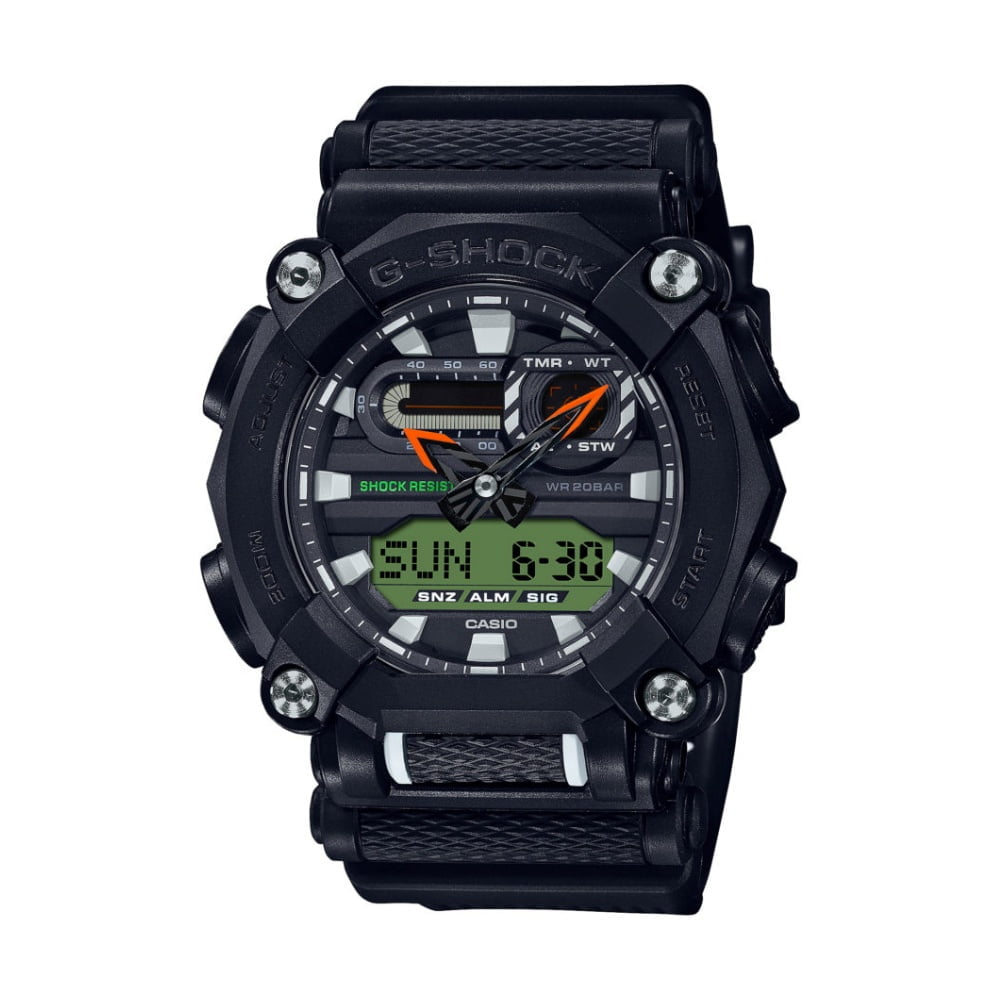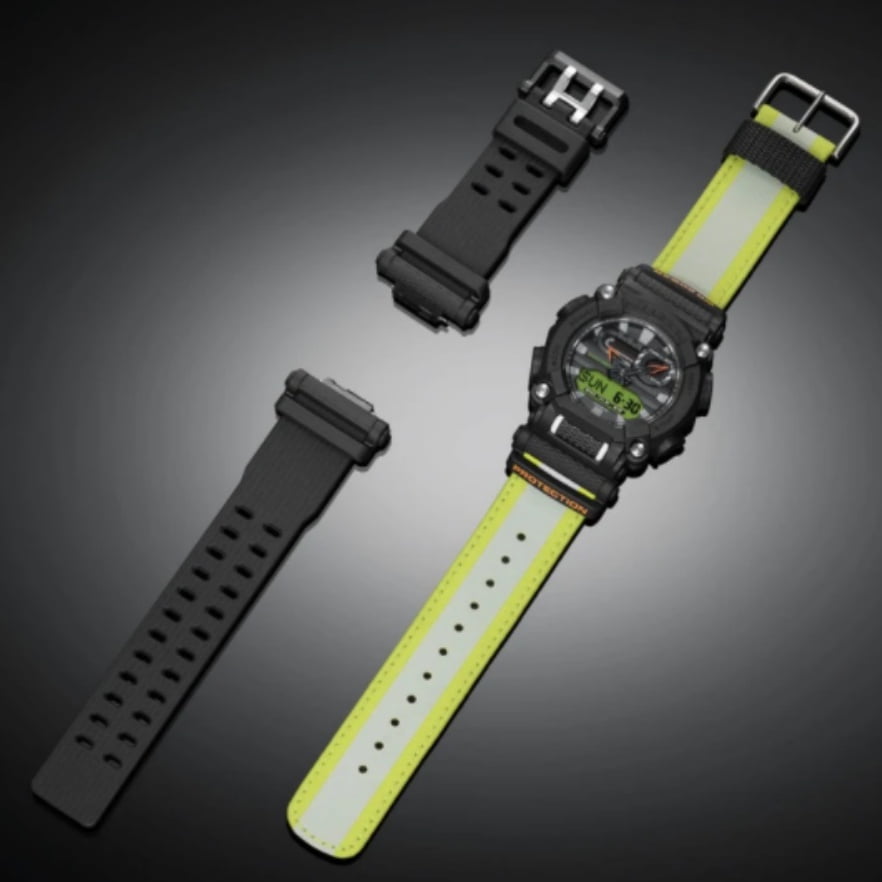 The industrial design motif of this model is created by a 10-sided bezel that resembles the shape of a nut. The bezel is secured by four screws for a tough and rugged look. Combination timekeeping is provided by analog hands along with a digital display for the ultimate in operational ease. The design of the hands and the graphic figures that appear in the digital readouts create a powerful face design that enhances readability. The band connection and all buttons have checkered surfaces that prevent slipping and contribute to operational efficiency. The black resin band of the GA-900E-1A3 model comes with both a black resin band and a cloth band that is interwoven with highly visible reflective yellow material.