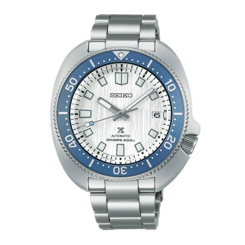 These three new Prospex diver’s watches draw inspiration from the polar oceans and from the glaciers that have shaped the landscapes of the Arctic and Antarctic regions. The varied shades of glacial ice are reflected in the dials, from deep blue to white. Powered by Caliber 6R35 which delivers a power reserve of 70 hours, these watches join the Prospex Save the Ocean series. The blue dial version is based on the design of Seiko’s first diver’s watch from 1965. The light blue dial features in a recreation of the legendary 1968 Hi-beat Diver’s watch and the white dial is encased in the distinctive shape of the 1970 classic.