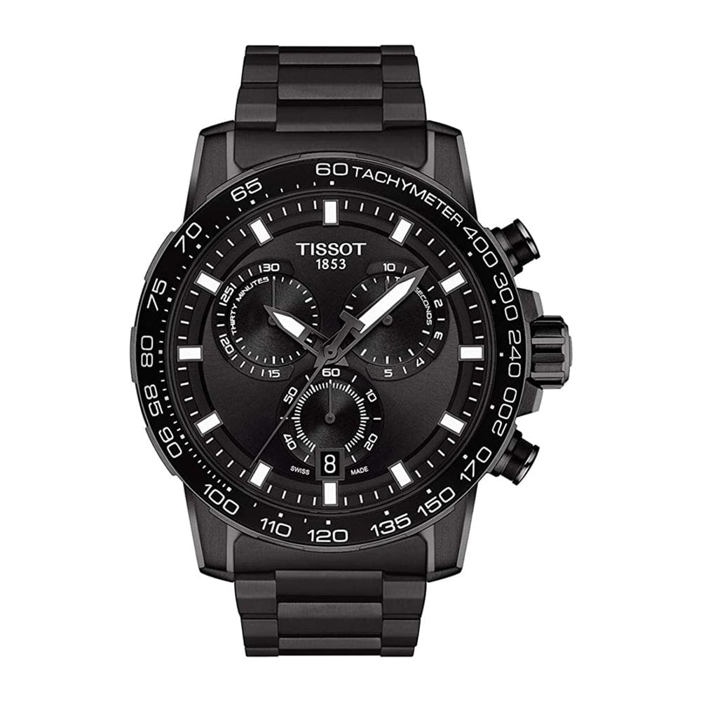 Die Tissot Supersport Chrono Kollektion ist perfekt für den modernen Gentleman, der seine Uhr im Alltag, Büro sowie bei sportlichen Ereignissen tragen möchte. Die geraden Linien und scharfen Kanten in Kombination mit dem 45,5 mm Gehäuse verleihen der Tissot Supersport Chrono eine starke Persönlichkeit. Die massiven Indizes mit SuperLuminova® Beschichtung sowie die asymmetrischen Applikationen auf dem Zifferblatt sorgen für einen kraftvollen 3D-Effekt, ein dynamisches Erscheinungsbild und ermöglichen eine beeindruckende Lesbarkeit bei Dunkelheit. Das handgenähte Vintage-Lederarmband harmoniert mit der Uhr und verleiht dem Chronographen ein sportliches und trendiges Aussehen. Alle Modelle des Tissot Chrono Supersport haben ein massives 316L- Edelstahlgehäuse, kratzfestes Saphirglas und besitzen eine Wasserdichtigkeit bis zu einem Druck von 10 bar (100 Metern/330 Fuß). Diese Ausführung der Tissot Supersport Chrono besitzt ein Swiss-Made Quartzwerk sowie ein 316L-Edelstahlgehäuse mit schwarzer PVD-Beschichtung. Das schwarze Zifferblatt mit Indizes ist farblich abgestimmt auf das massive 316L-Edelstahlarmband mit schwarzer PVD-Beschichtung mit Sicherheitsfaltschließe und Taucherverlängerung.