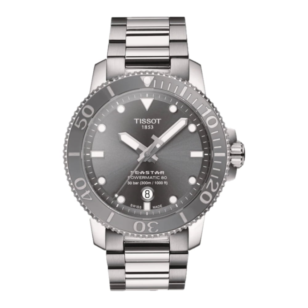 The automatic choice for divers. With its high water-resistance up to a pressure of 30 bar (300 m/1000 ft), screw-down crown and caseback as well as its unidirectional ceramic bezel, the Tissot Seastar 1000 is the ultimate diving watch, now combined with the energy of the Powermatic 80 movement.