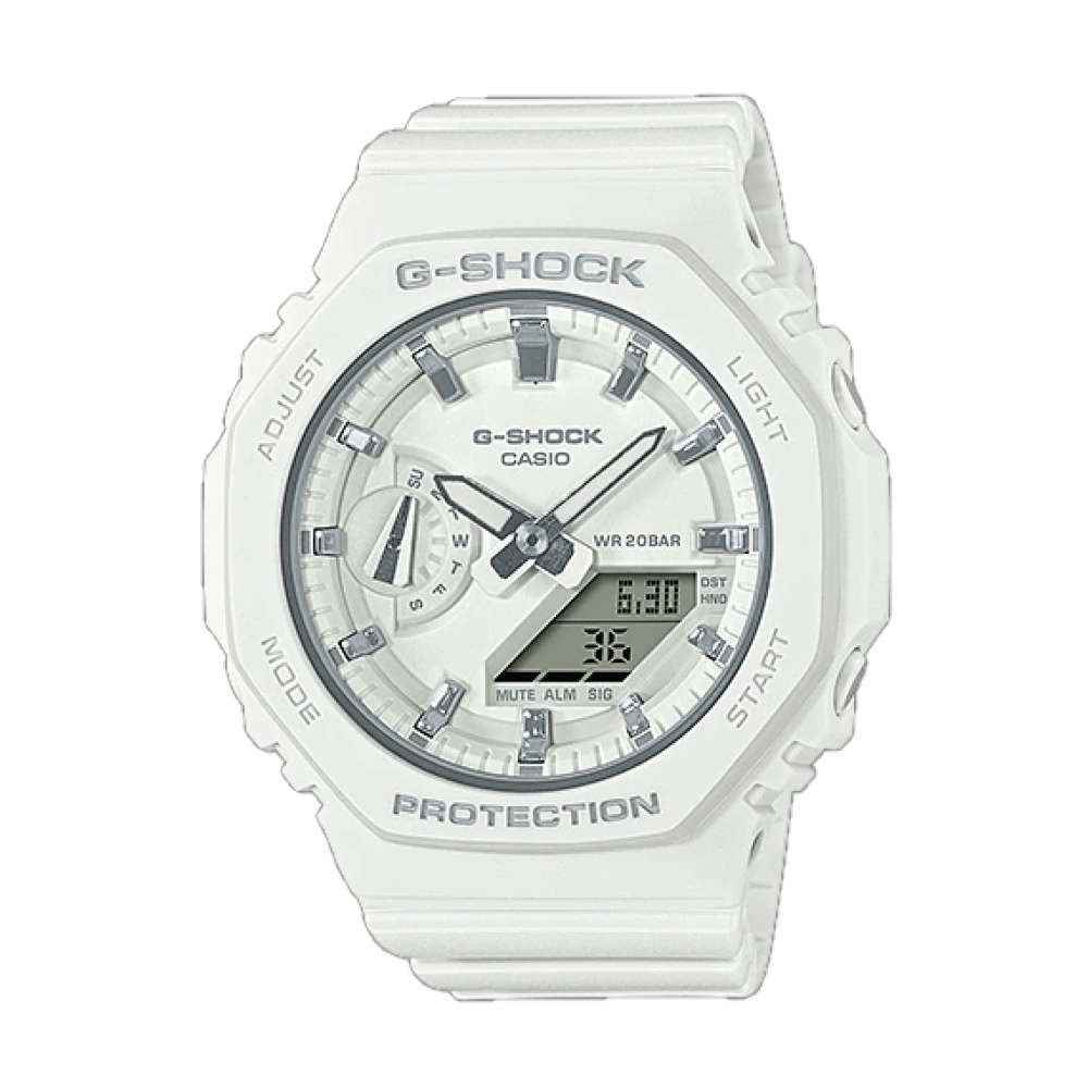 The octagonal bezel, flat face, simple bar hour markers, and carbon core guard structure that are distinctive features of the GA-2100 are now available in a compact configuration.