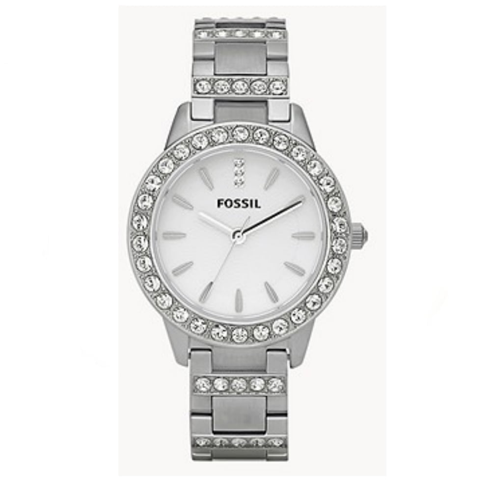 Clear stones encircle the dial of this stainless steel watch. All along the bracelet, links are decorated with shiny crystals. And for even more sparkle, a stone sits at the 12-hour mark. This Jesse watch also features a three hand movement.